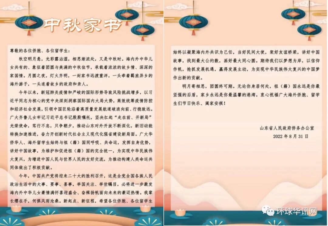 “平分秋色一轮满,常伴云衢千里明。”中秋临近,远在世界各地的山东人心头涌起浓浓的乡愁。为了表达家乡政府和家乡人民的关怀和祝福,由山东省侨办主办、山东华侨会馆(山东华侨博物馆)承办的“月圆中秋 家乡味道”慰侨活动于中秋节前夕举办。慰侨活动将向韩国、英国、法国、俄罗斯、澳大利亚、塞尔维亚等22个国家的海外华侨华人、华文学校师生、留学生等赠送中秋月饼,发放山东省人民政府侨务办公室给海外侨胞的《一封家书》和山东华侨会馆(山东华侨博物馆)的祝福彩页。 《家书》说,中秋佳节承载着浓浓的故乡情、家国情。在这团圆时刻,一封家书远渡重洋,一头牵着羁旅异乡的海外游子,一头连着故乡的政府和亲人。今年以来,新冠肺炎疫情和乌克兰危机导致风险挑战增多,广大华侨华人、海外留学生始终与祖(籍)国同呼吸、共命运,发挥自身优势,讲好中国故事,为维护和促进祖(籍)国的完全统一,为实现中华民族伟大复兴,为增进中国人民与世界人民的友好交流,为推动构建人类命运共同体做出了积极贡献。